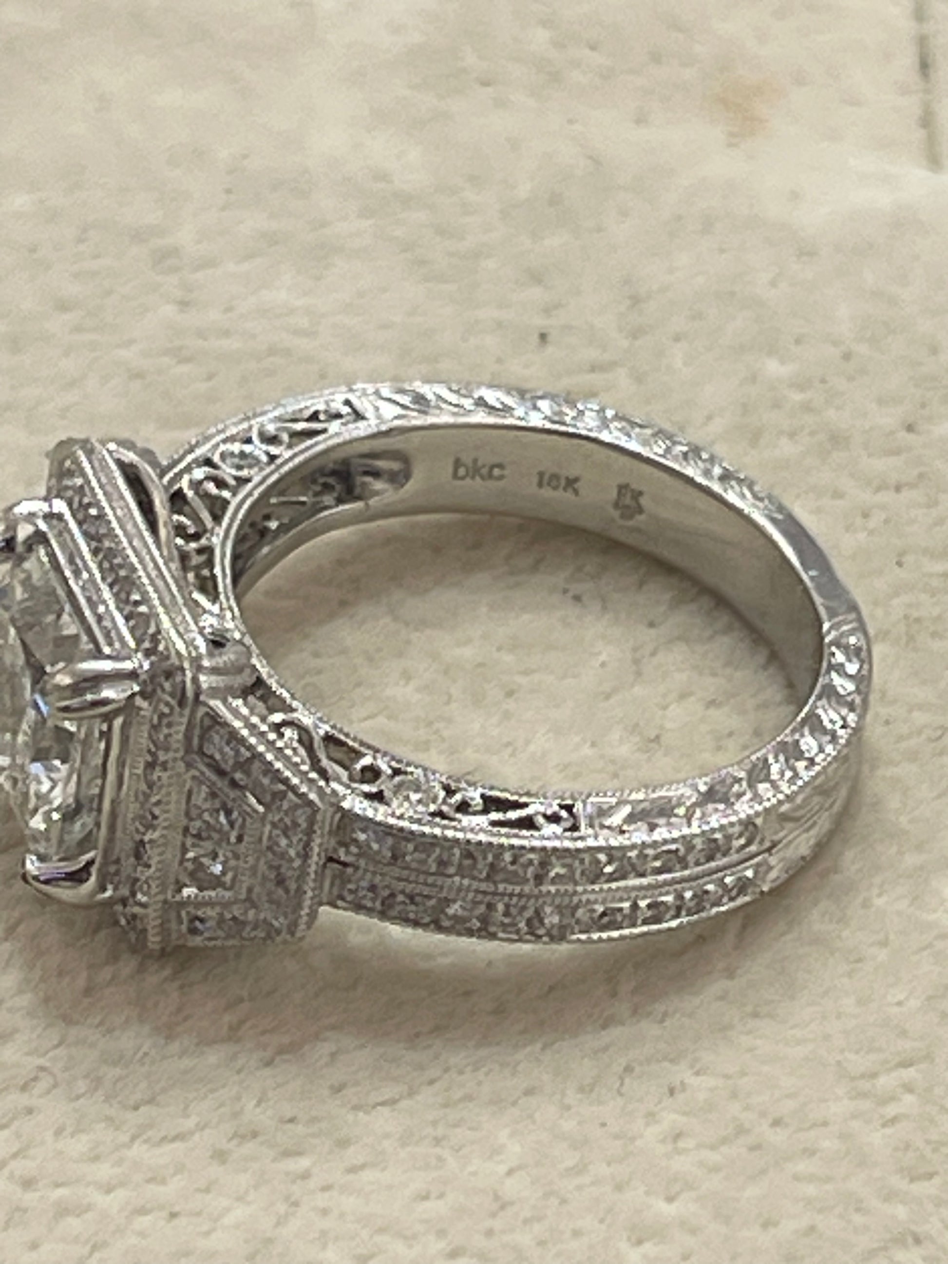 This 10K radiant cut Diamond white Gold Ring is adorned with a stunning 2 carat radiant cut Diamond. The intricate side stones and meticulous engraving add extra sparkle and detail to this exquisite piece. Elevate any outfit with this timeless and elegant ring.