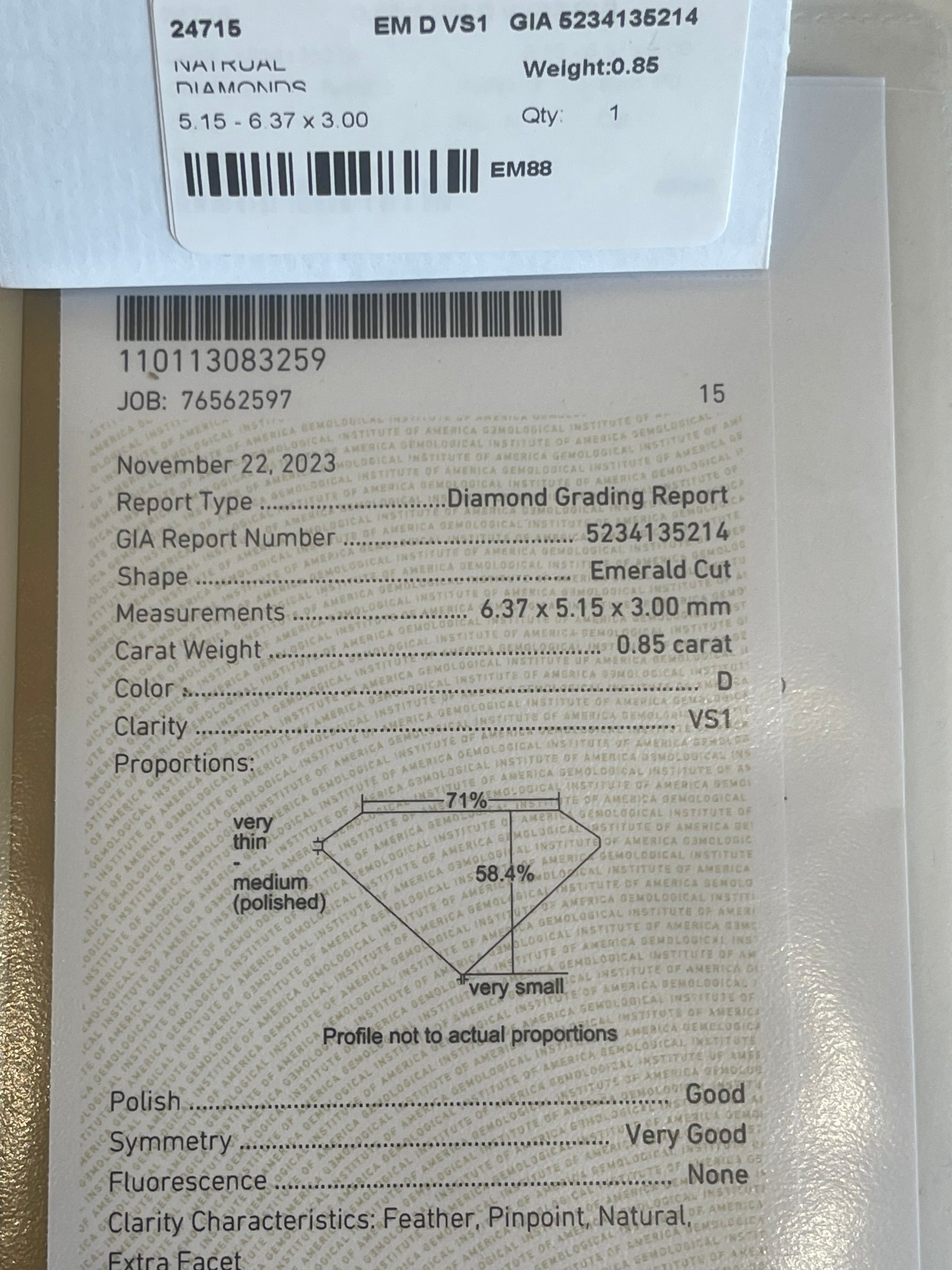 Discover the timeless elegance of our 0.85ct emerald cut natural diamond. With its impeccable emerald shape and GIA certification, this diamond radiates luxury and sophistication. Perfect for any occasion, its 0.85 carat weight adds to its undeniable beauty. Invest in a diamond that will last a lifetime.