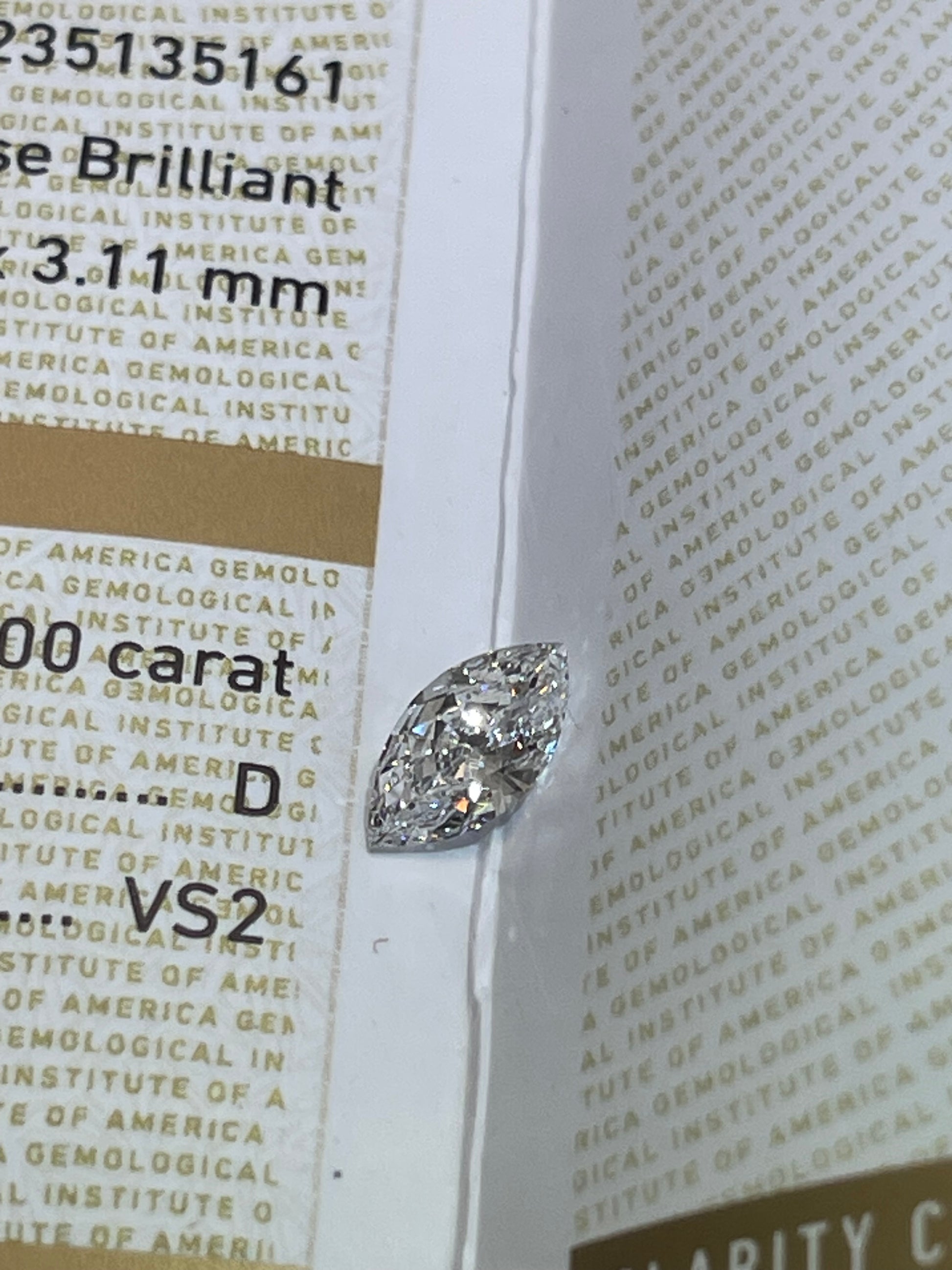 This exquisite 1.00 carat marquise diamond boasts a brilliant D color, the finest on the color scale, radiating exceptional clarity with a VS2 grade. Its elongated, tapered shape, reminiscent of a marquise, adds a touch of elegance and sophistication. The diamond is accompanied by a GIA grading report, ensuring its authenticity and quality. This exceptional gem is perfect for creating a stunning engagement ring, pendant, or other fine jewelry piece.